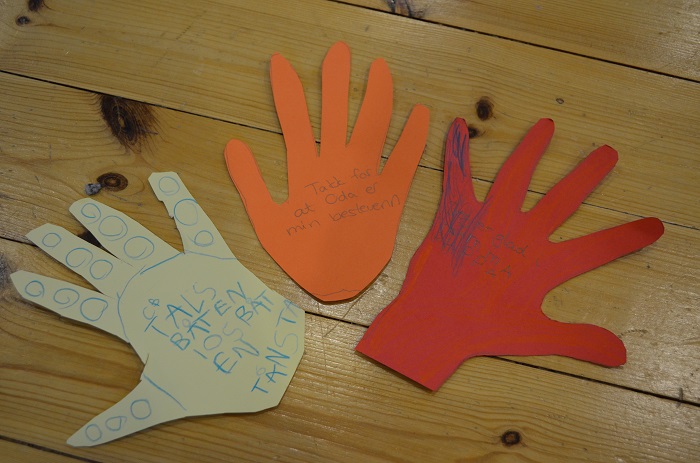 Elles laga me eit takketre. Her fekk alle teikna rundt handa si og klyppa ut, skriva noko dei var takksame for, og festa desse i greinene på treet. Me avslutta med bollar og høgtlesing i boka dei skulle få utdelt på sundagen.